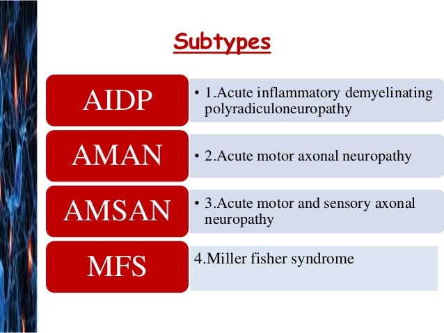 Including acute motor axonal neuropathy, acute motor and sensory axonal neuropa-thy, and Miller Fisher syndrome.1 The subtypes differ in pathologic and electrodiag-nostic features. Treatment of acute immune-medicated neuropathies: Guillain- ... Fetch Here